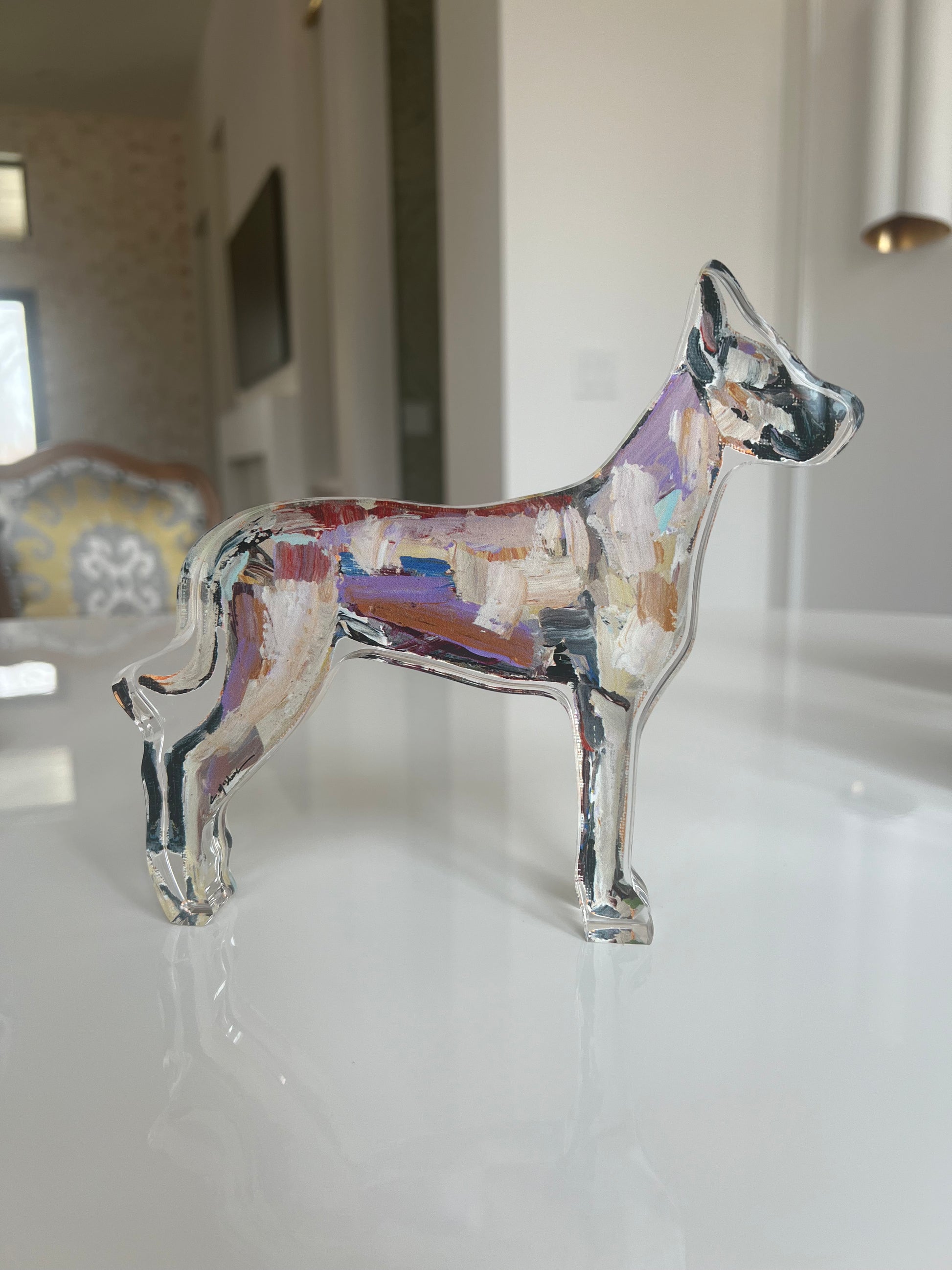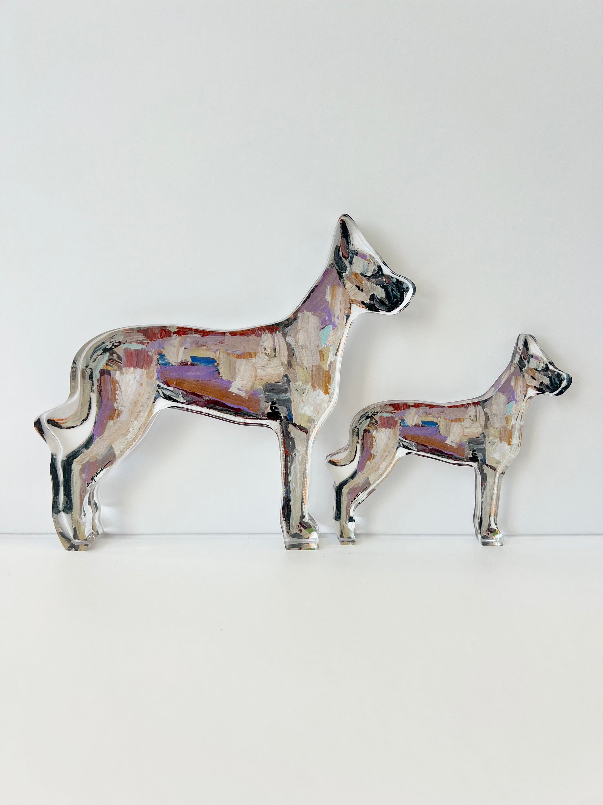 - All acrylic sizes vary depending on design. The larges range between 6X6 to 3X7, 3/4" thick. The minis are on average 2.5 X 4.5", 1/2" thick