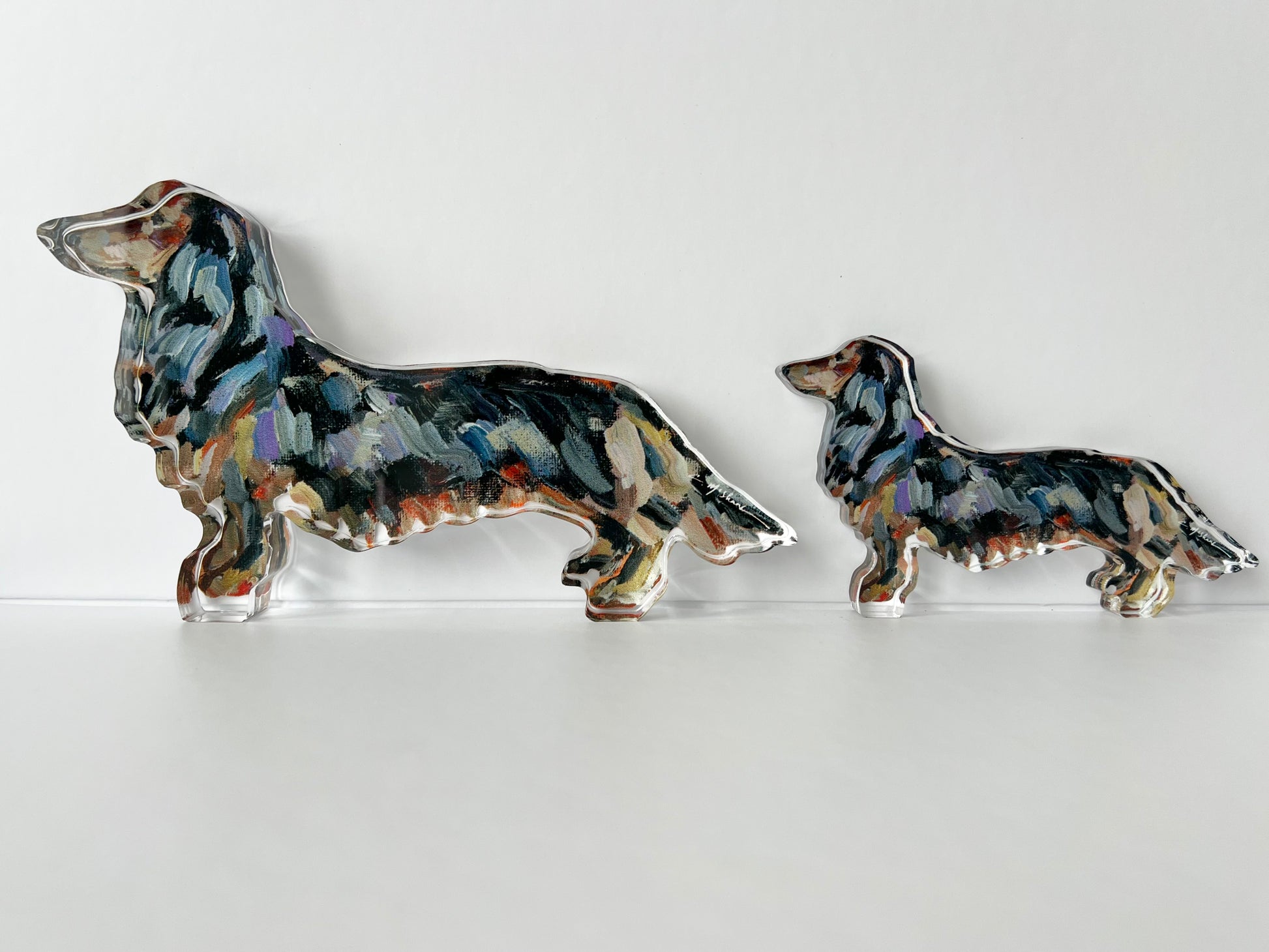 - All acrylic sizes vary depending on design. The larges range between 6X6 to 5X7, 3/4" thick. The minis are on average 2.5 X 4.5", 1/2" thick