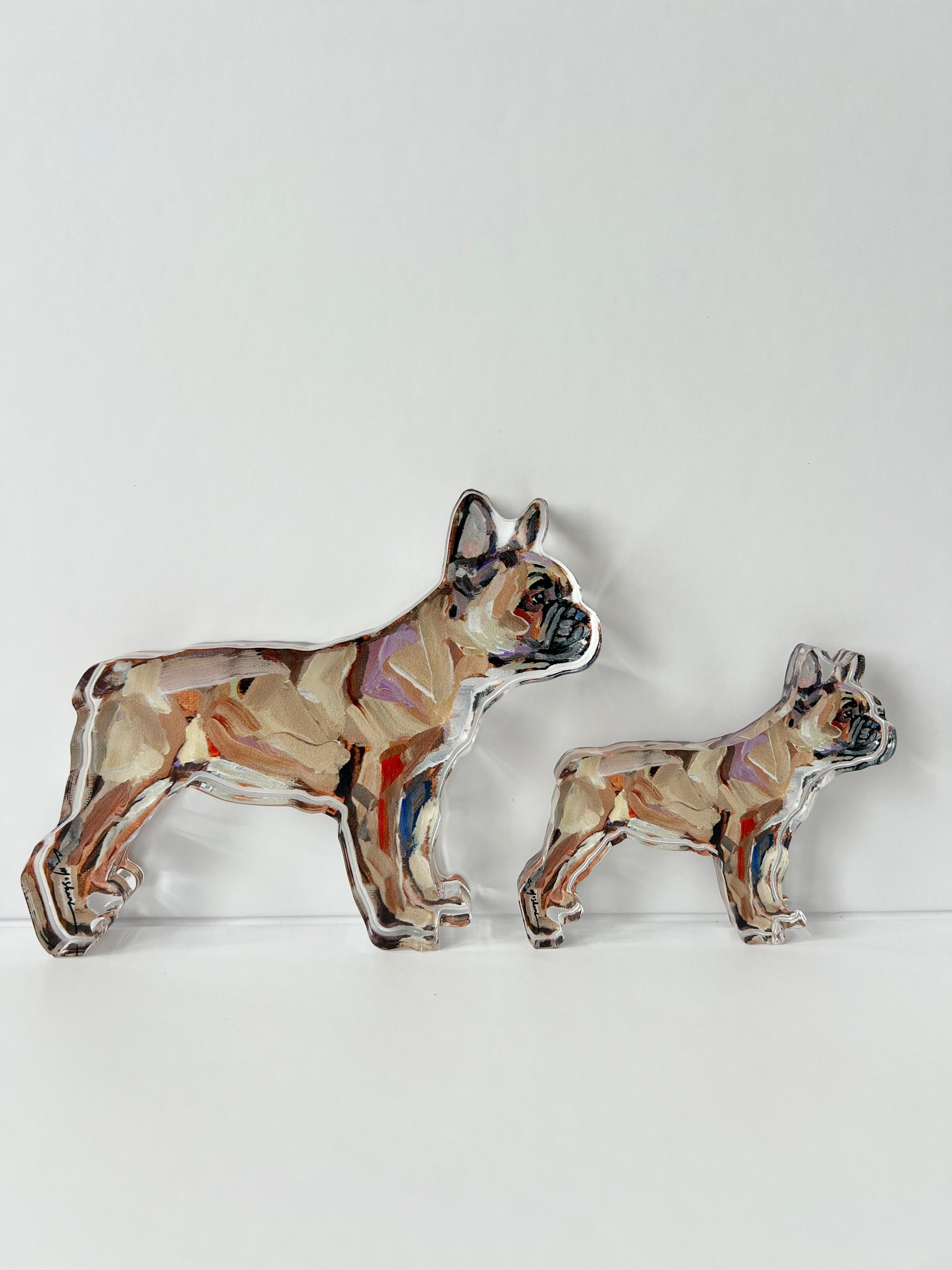 - All acrylic sizes vary depending on design. The larges range between 6X6 to 5X7, 3/4" thick. The minis are on average 2.5 X 4.5", 1/2" thick