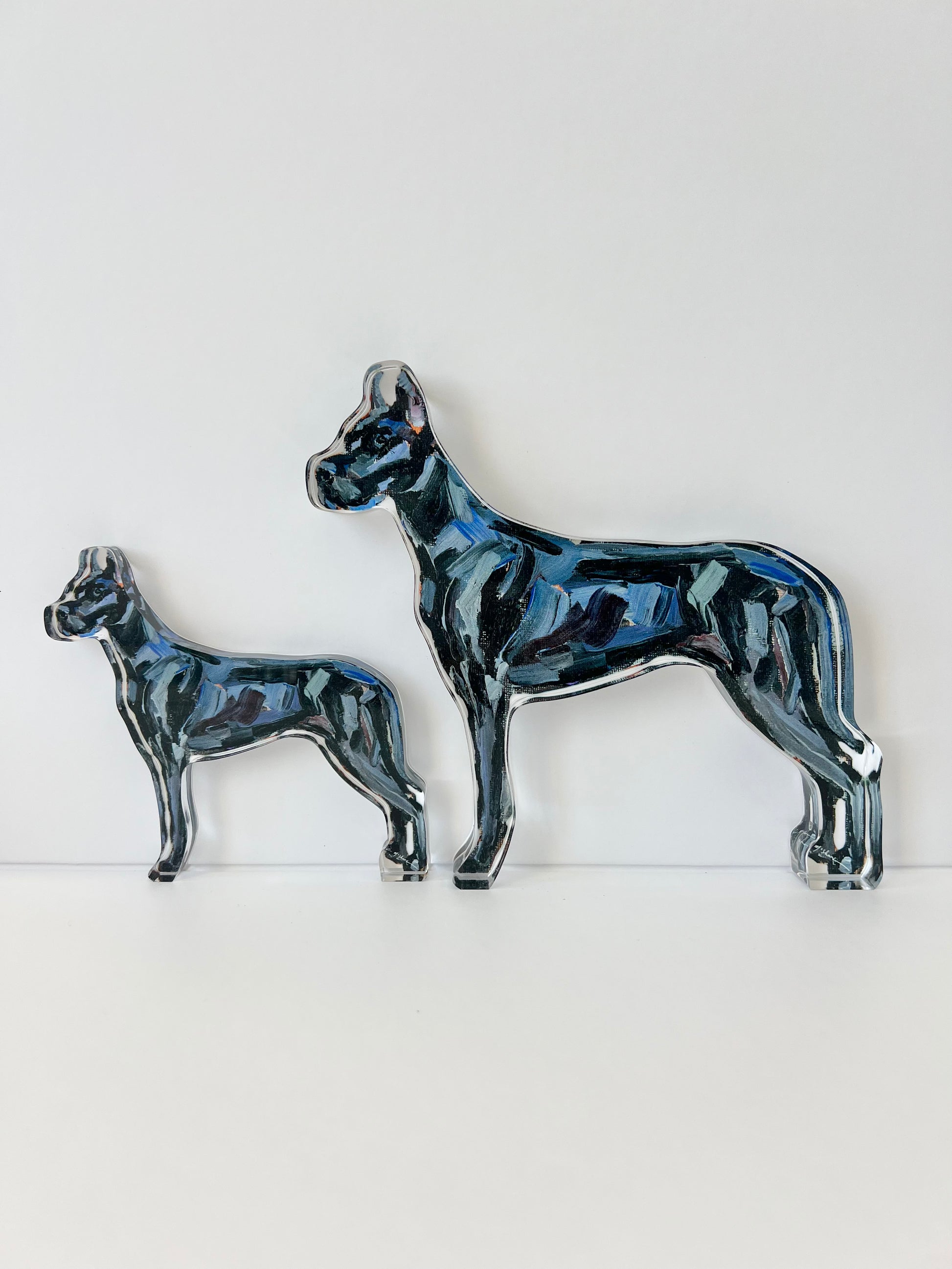 - All acrylic sizes vary depending on design. The larges range between 6X6 to 3X7, 3/4" thick. The minis are on average 2.5 X 4.5", 1/2" thick