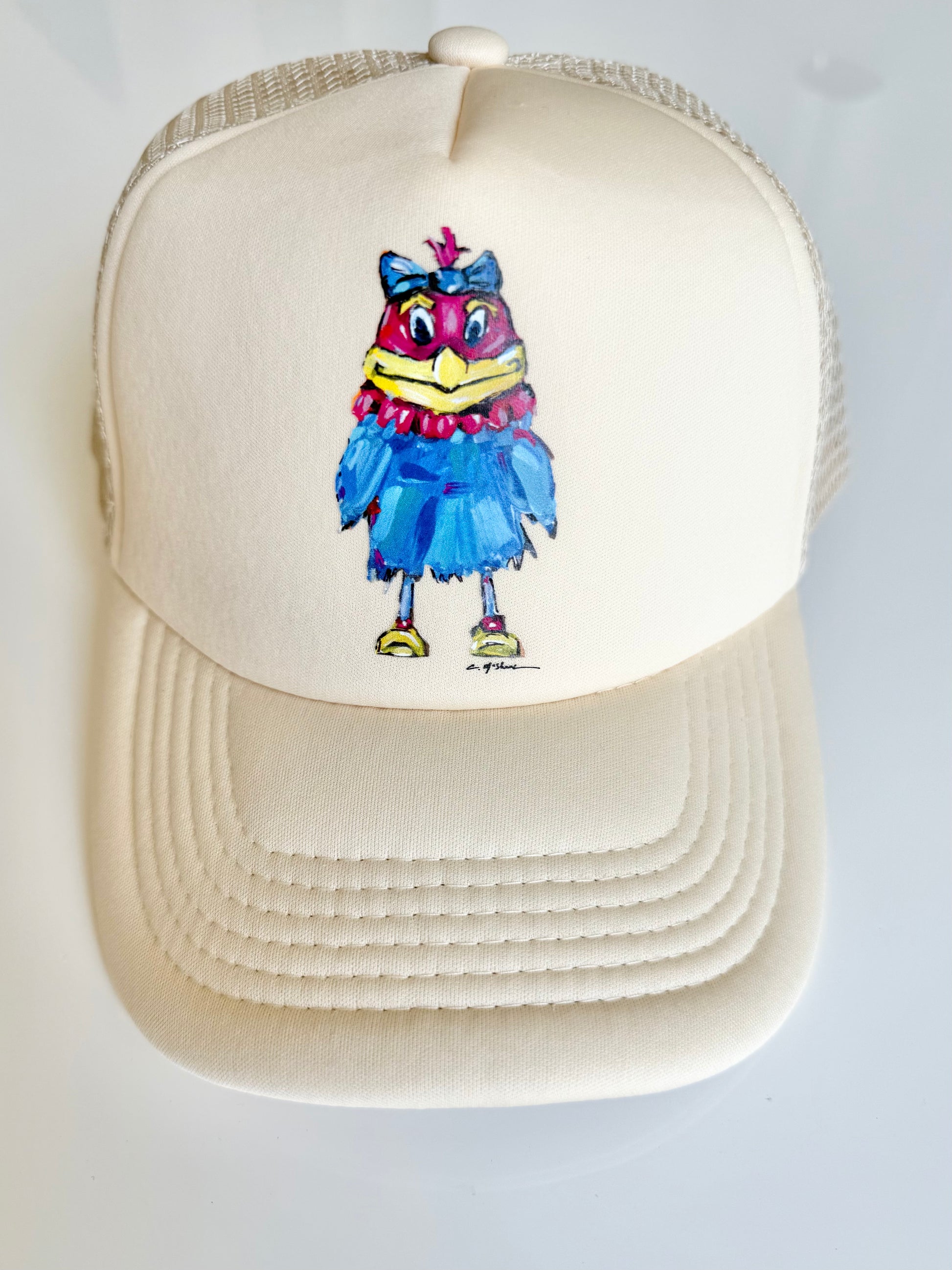 A mesh back trucker style hat with a plastic snap closure.