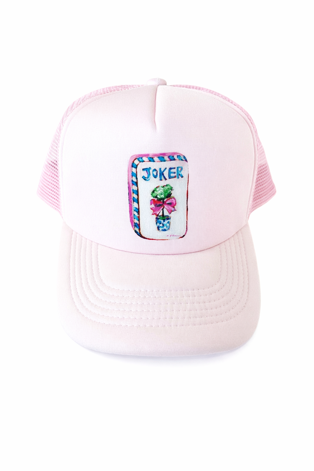 A light pink mesh back trucker style hat with a plastic snap closure.