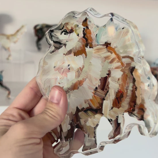 - All acrylic sizes vary depending on design. The larges range between 6X6 to 3X7, 3/4" thick. The minis are on average 2.5 X 4.5", 1/2" thick