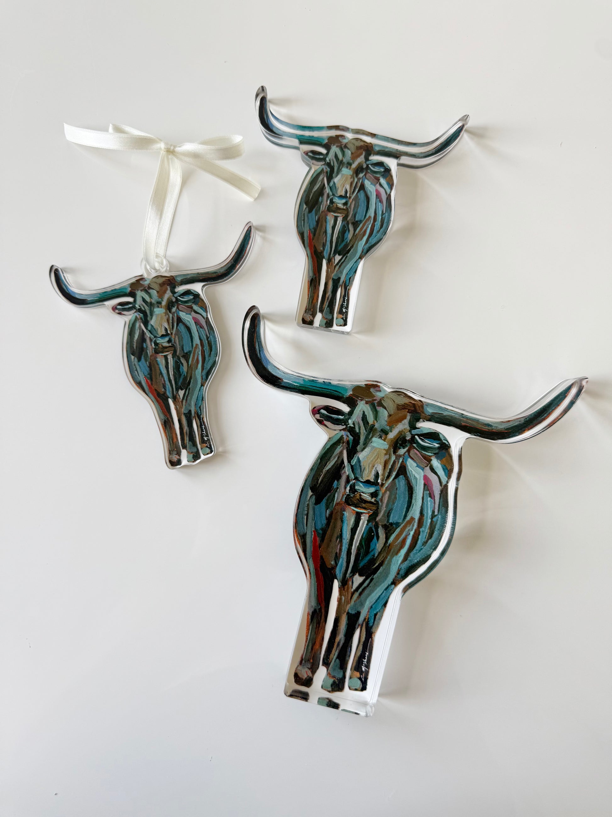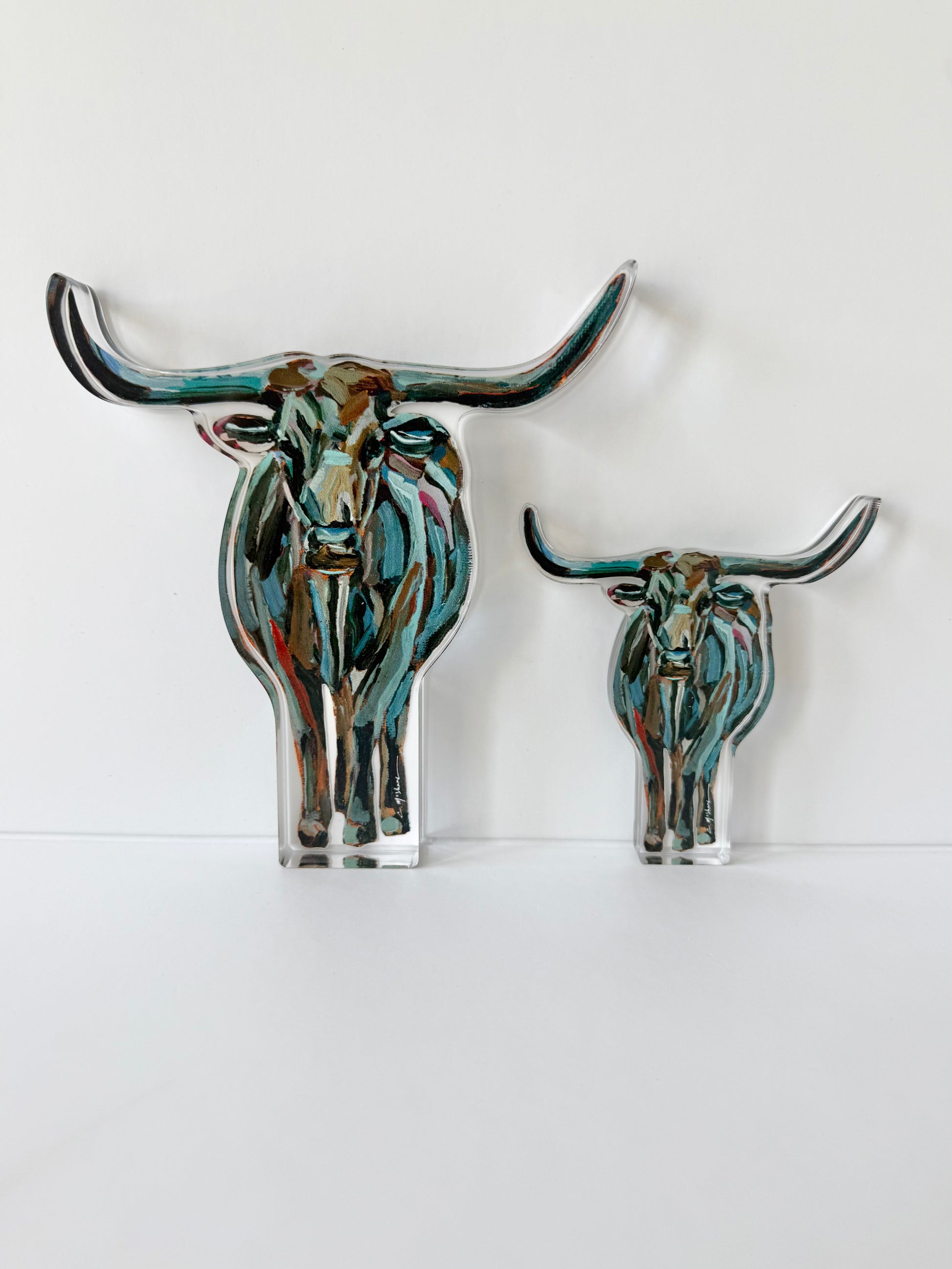 - All acrylic sizes vary depending on design. The larges range between 6X6 to 3X7, 3/4" thick. The minis are on average 2.5 X 4.5", 1/2" thick