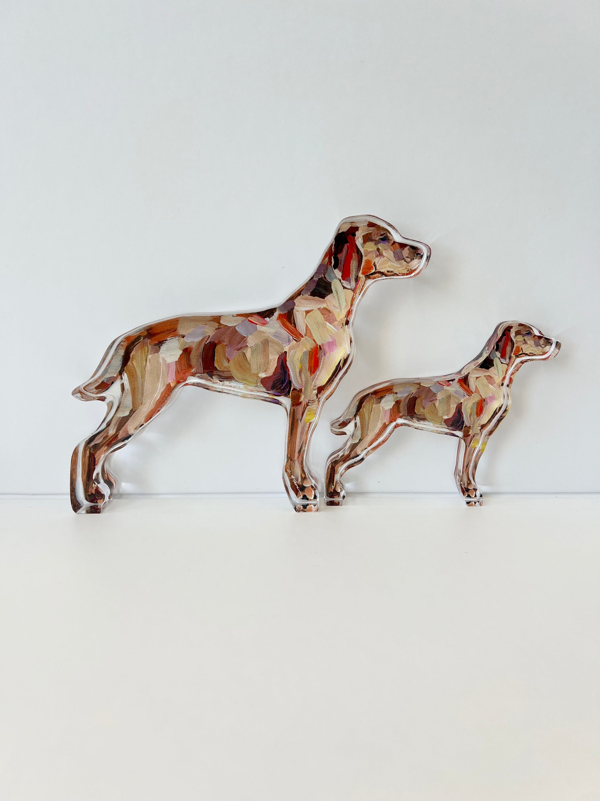 - All acrylic sizes vary depending on design. The larges range between 6X6 to 3X7, 3/4" thick. The minis are on average 2.5 X 4.5", 1/2" thick